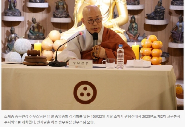 Á¶°èÁ¾ Ãѹ«¿øÀå Áø¿ì½º´ÔÀº ºÒ±â2570(2026)³â Áß¾ÓÁ¾¹«±â°ü ¿¹»ê¾ÈÀ» È®Á¤ÇÏ´Â 11¿ù Áß¾ÓÁ¾È¸ Á¤±âȸ¸¦ ¾ÕµÎ°í Àü±¹ ±³±¸º»»ç ÁÖÁö ½º´Ôµé¿¡°Ô ³»³âµµ ¿¹»ê¾ÈÀ» °øÀ¯Çϰí, ¹Ì·¡¼¼´ë¸¦ À§ÇÑ Á¾Ã¥ ¿¬±¸¿Í Áö¿ø µî 37´ë Ãѹ«¿ø ÁýÇàºÎ ÁÖ¿ä Á¾Ã¥ »ç¾÷À» Â÷Áú ¾øÀÌ ÃßÁøÇÒ °ÍÀ» °Á¶Çß´Ù.