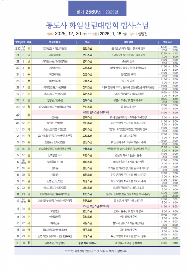¿µÃàÃѸ² Åëµµ»ç°¡ ºÒ±â 2569³â µ¿¾È°Å¸¦ ¸Â¾Æ ȾöÀÇ ÁöÇý·Î ¼öÇࡤ±³ÈÀÇ »ê¸²À» ¿©´Â ¡®2025 Ⱦö»ê¸² ´ë¹ýȸ¡¯¸¦ ¿À´Â 12¿ù 20ÀÏ ÀÔÀçÇØ 2026³â 1¿ù 18ÀÏ È¸ÇâÇÑ´Ù. ¡®È¾ö¼¼°è·ÎÀÇ ±¸¹ý¿©Ç࡯À» ÁÖÁ¦·Î ¿¸®´Â ¿ÃÇØ »ê¸²Àº 100³â ÀüÅëÀÇ ¹ý¸ÆÀ» ÀÌÀ¸¸ç, ÇÑ ´Þ µ¿¾È 30¸íÀÇ ¹ý»ç ½º´ÔÀÌ È¾ö°æÀ» °¼³ÇÏ´Â Àå¾öÇÑ ¹ý¼®À¸·Î ¸¶·ÃµÈ´Ù.