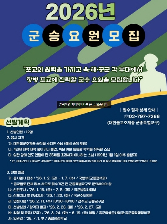 Á¶°èÁ¾ ±ºÁ¾Æ¯º°±³±¸(±³±¸Àå ¹ý¿ø½º´Ô)´Â ¡°±¹¹æºÎ 2026³â ±ºÁ¾Àå±³(¿ä¿ø) ¼±¹ß °èȹ¿¡ µû¶ó 2026³â ÀÓ°ü ±º½ÂÀ» ¸ðÁýÇÑ´Ù¡±°í ¹àÇû´Ù. ±ºÁ¾±³±¸´Â 2026³â ÀÓ°üÇÒ ±º½ÂÀ» 12¸í ¼±¹ßÇÑ´Ù´Â °èȹÀÌ´Ù.